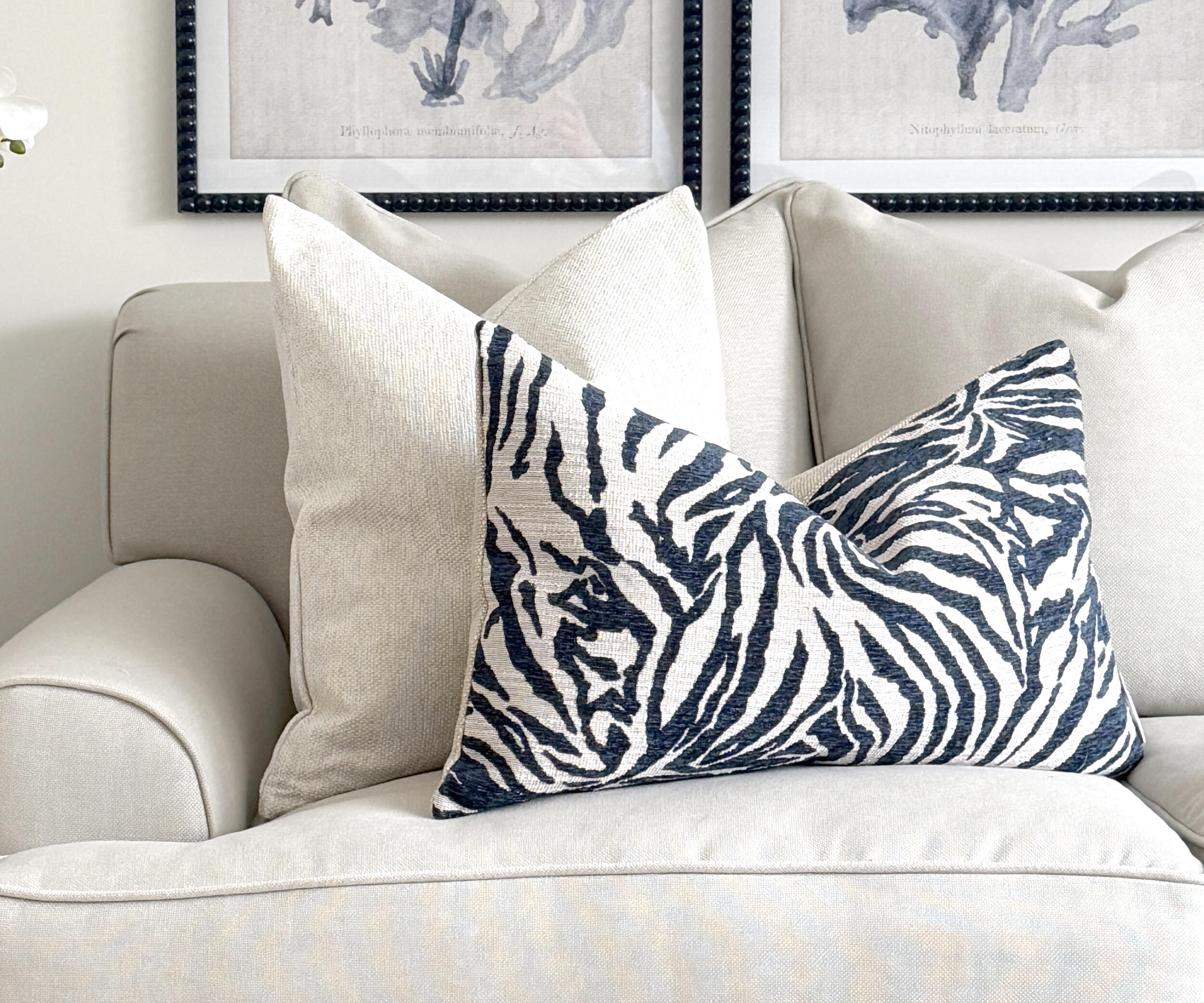 Spruce up your seating space with our Zebra cushion in Indigo, a fun yet elegant design. Features a complementary plain, weave fabric back and comes with a luxury feather filler. Elevate your home with this delightful creation.