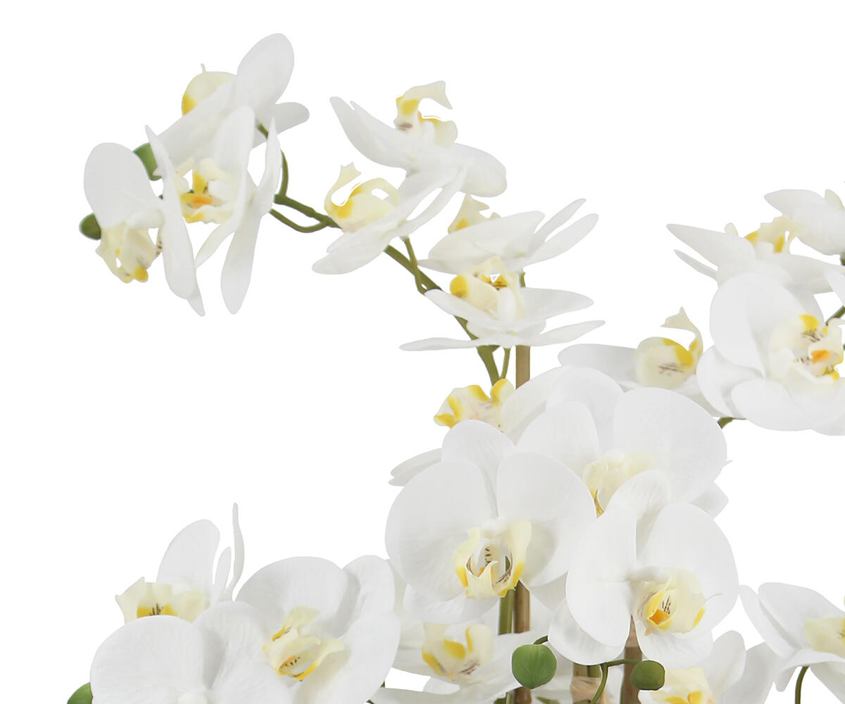 Crafted exclusively for Nordic Style, this striking Orchid arrangement is a unique addition to any home. Displayed in a beautiful blue and white pot with a lifelike faux moss and soil base, it features 3 realistic stems, delicate white flower heads, and lush leaves that add an elegant touch. Each stem is adjustable, allowing you to style the arrangement to your preference.